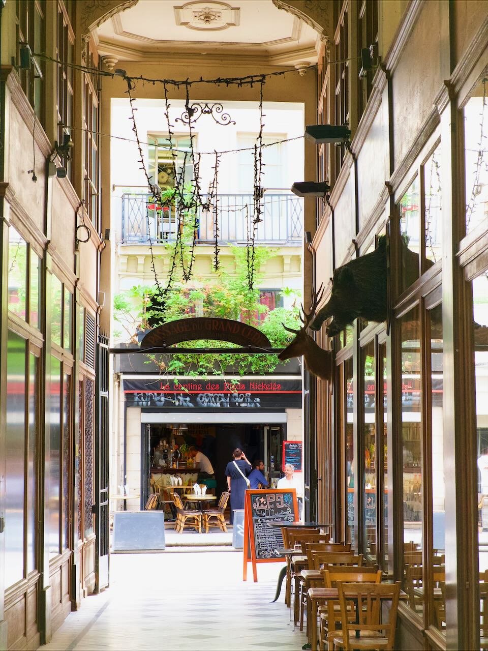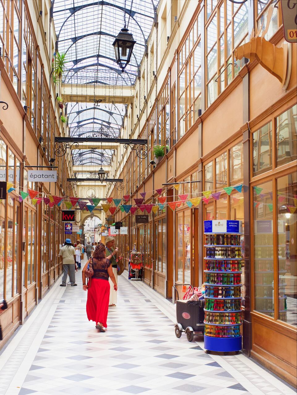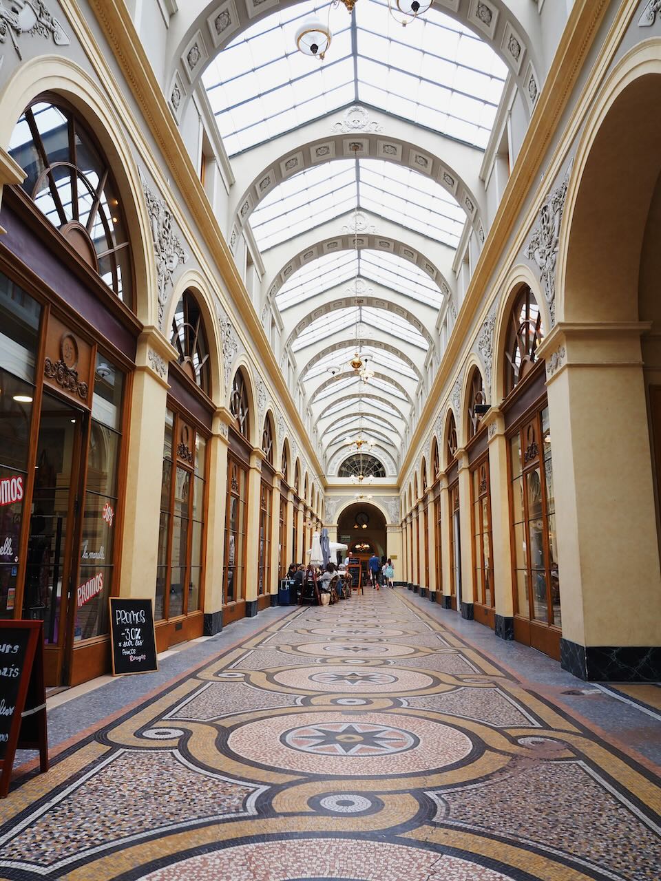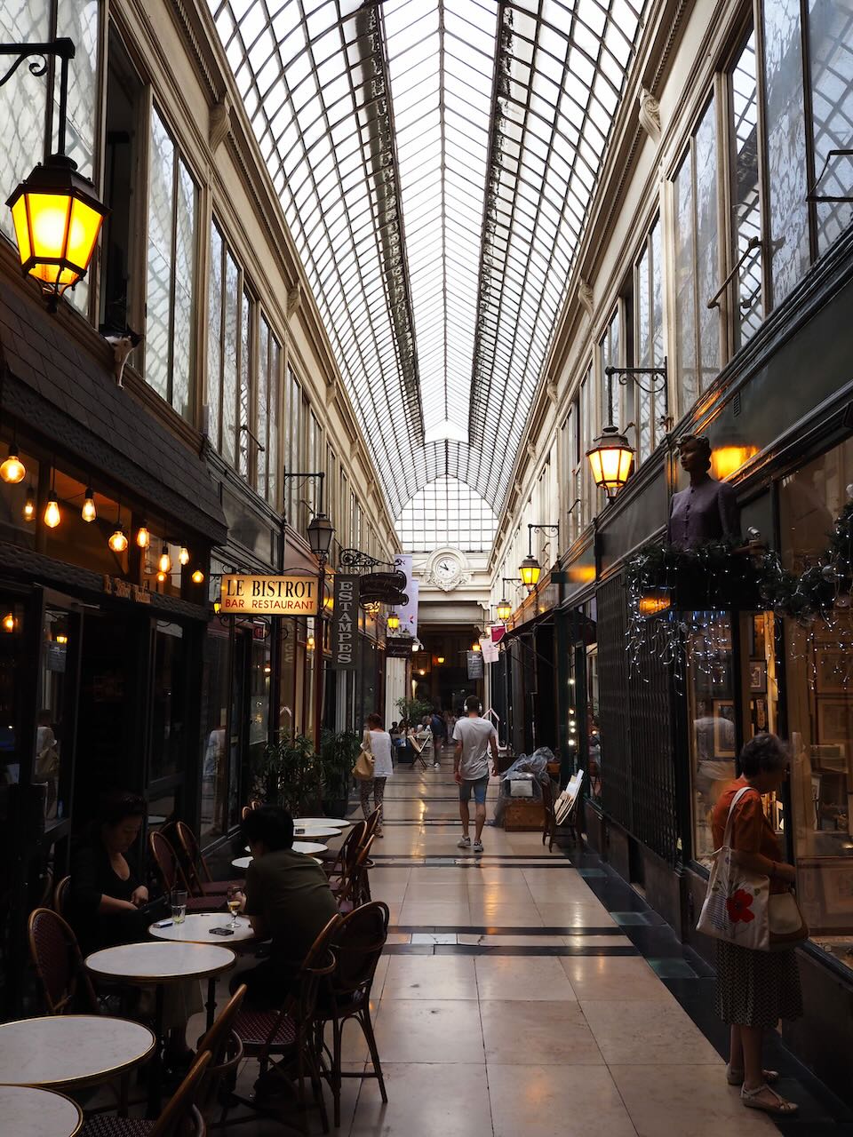 These arcades typically have some kind of skylight, flooding them with natural light from above. Varying in width, some are crowded with tables and shop displays while others are more spartan and open. Almost all of them are lined with stores, cafes, and restaurants.